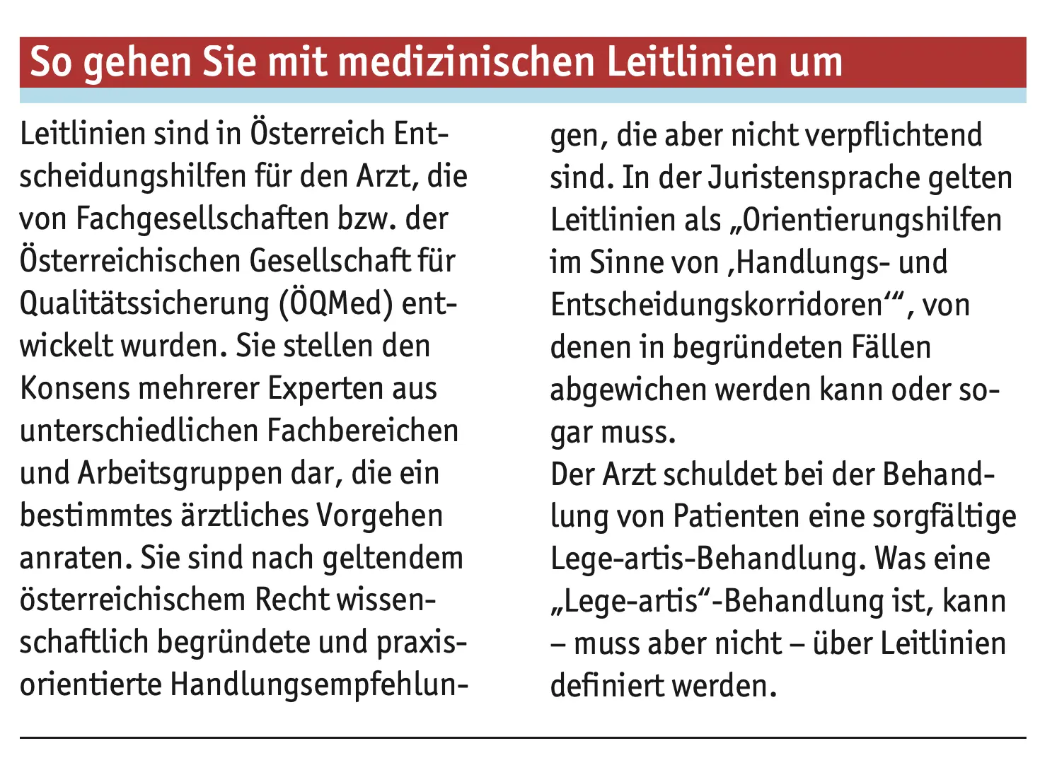Der Arzt schreibt für die häufigsten Krankheitsbilder seiner Ordination genaue Behandlungsleitlinien vor. Dabei ist er völlig ungebunden: Aber natürlich ist es sinnvoll, sich an den offiziellen Behandlungsleitlinien der jeweiligen Fachgesellschaften bzw. der Österreichischen Gesellschaft für Qualitätssicherung (ÖQMed) zu orientieren. Wenn es in der Ordination für die häufigsten Krankheitsbilder einheitliche Vorgaben gibt, beschleunigt dies den Arbeitsablauf. In der Praxis werden die Leitlinien der ÖQMed mit den Alltagserfahrungen der eigenen Ordination angereichert. Sämtliche Teammitglieder wissen, was zu tun ist. Der Arzt sichert die Qualität seiner Leistung.