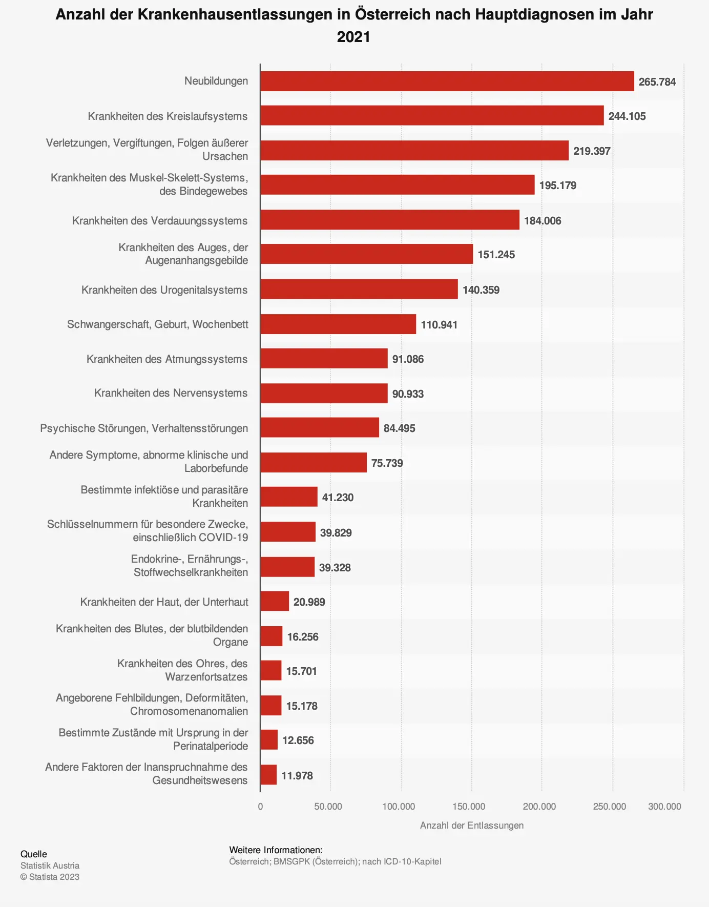 Die vorliegende Statistik zeigt die Anzahl der Krankenhausentlassungen in Österreich nach Hauptdiagnosen im Jahr 2021. Eine vergleichbare Statistik für den niedergelassenen Bereich existiert in Österreich bislang mangels Diagnosecodierung nicht.