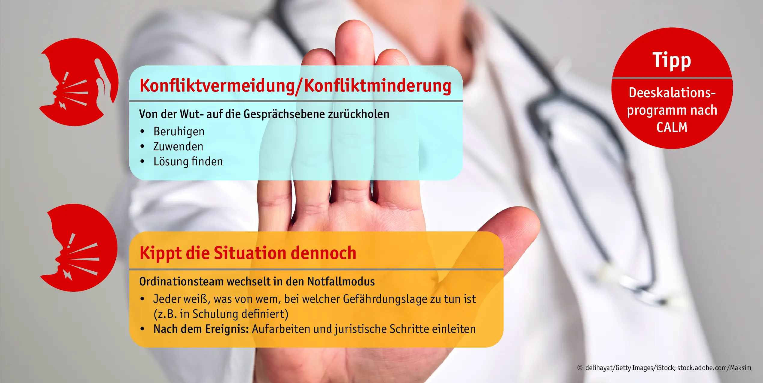 Deeskalationsprogramme für Gesundheitseinrichtungen zählen heute zum Angebot jeden besseren Coachingunternehmens. Die Programme helfen, prekäre Situationen frühzeitig zu erkennen. Im Zuge der Workshops erarbeiten die Ärztinnen und Ärzte sowie deren Ordinationsteams Notfallpläne, die helfen, unter Druck die Wut des Patienten in ruhigere Bahnen zu leiten. Denn die meisten Situationen lassen sich durch eine geschickte verbale Intervention entschärfen. Die Ziele sind stets gleich: Den Patienten beruhigen und ihm das Gefühl geben, er wird gehört. Dann erst kann daran gegangen werden, den konkreten Beschwerdegrund zu eruieren und gegebenenfalls aufzuklären.
