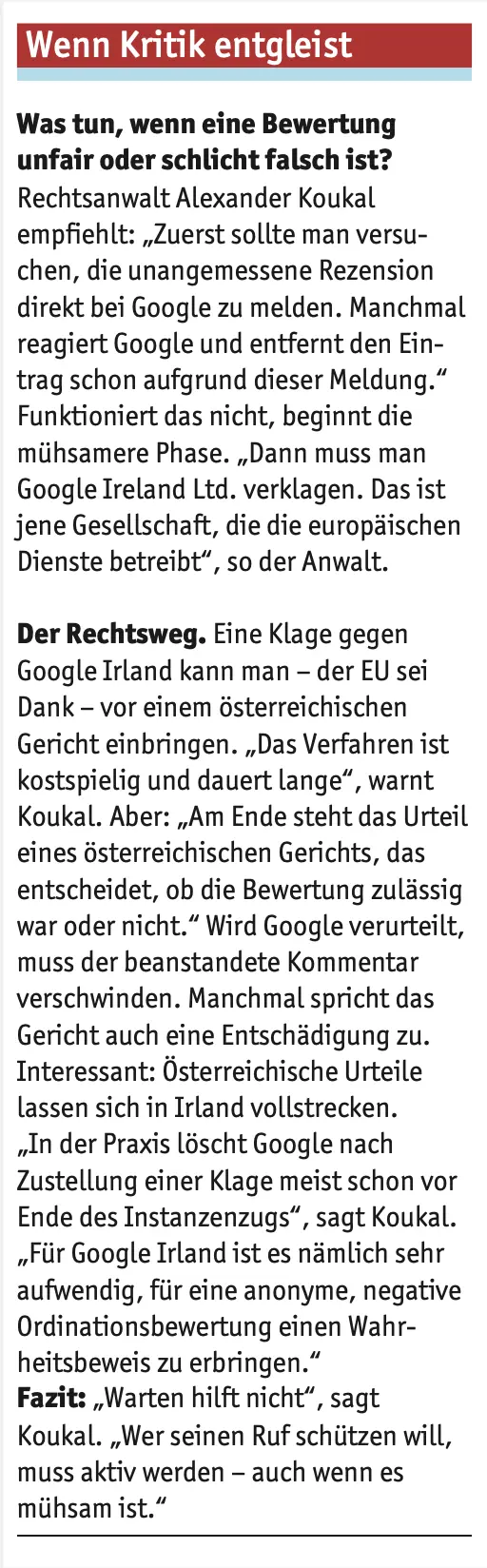 Rechtsanwalt Alexander Koukal von der Wiener Kanzlei Höhne, In der Maur und Partner kennt die Sorgen von Ordinationsbetreibern. Sein wichtigster Rat: „Übernehmen Sie Ihr Profil aktiv und gestalten Sie es selbst. Wer die Informationen dort in die Hand nimmt, kann vieles steuern.“