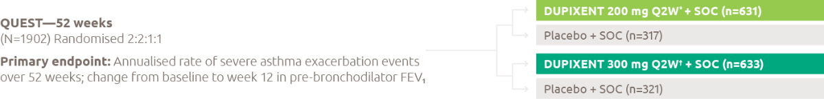Quest was a phase 3, randomised, double-blind, placebo controlled, parallel-group study in patients aged ≥12 years with uncontrolled moderate-to-severe asthma.1