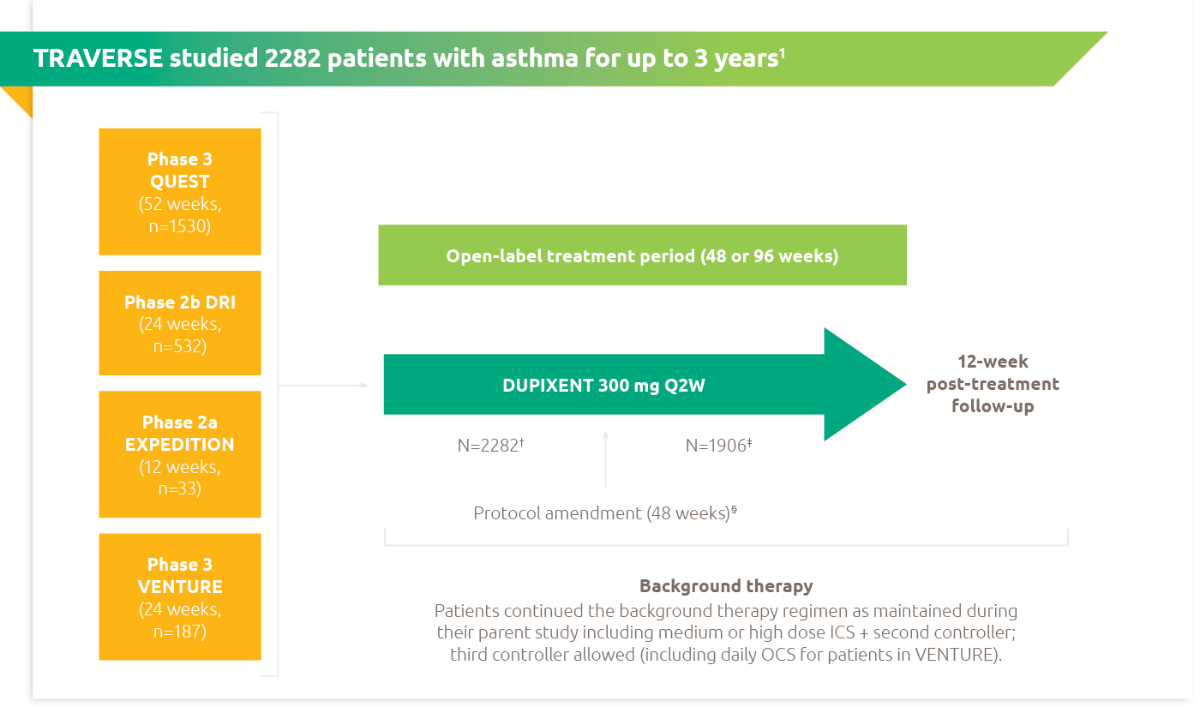 Traverse was an open-label extension study of 2282 patients (adults and adolescents) with moderate-to-severe or oral-corticosteroid-dependent severe asthma who had completed a previous Dupixent asthma study.4