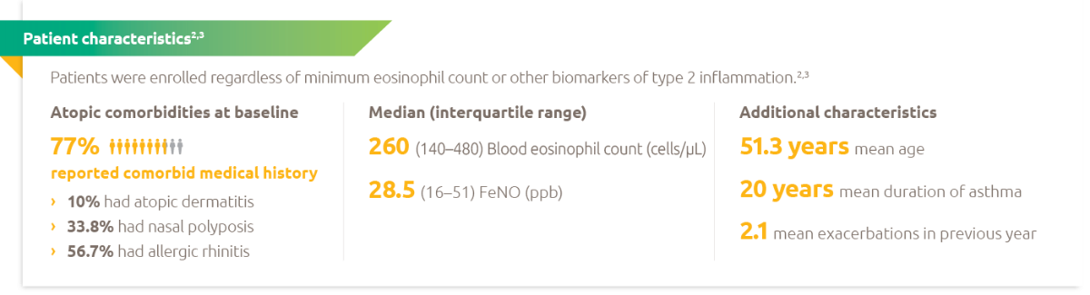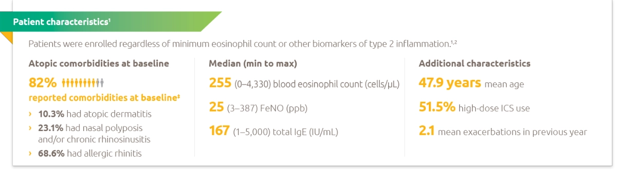 The population included patients on medium-to-high dose ICS (fluticasone propionate ≥500 µg/day or equipotent equivalent). Up to 2 additional controllers (e.g. LABA or LTRA) were allowed.1