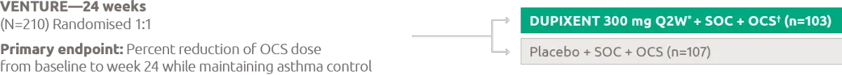 Venture was a 24-week oral corticosteroid-reduction study in 210 patients with asthma who required daily oral corticosteroids in addition to regular use of high dose inhaled corticosteroids plus an additional controller.