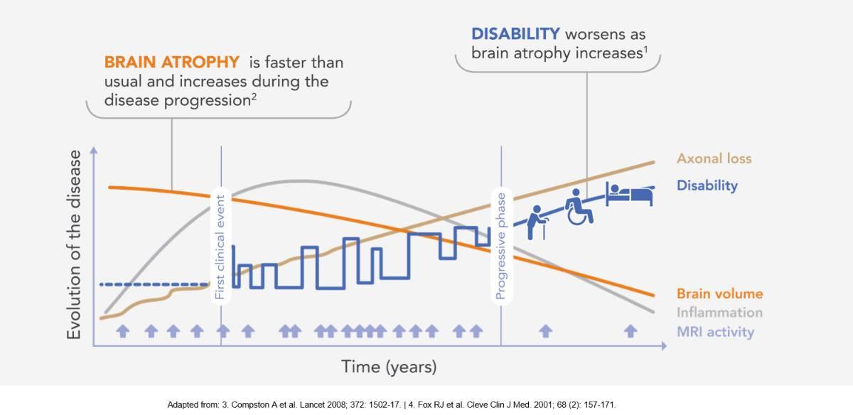Bij niet-behandelde patiënten kent de ziekte een sneller verloop. Daarom is het van belang om zo snel mogelijk te starten met een behandeling. Studies tonen aan dat behandelen zodra de diagnose bekend is, helpt om de ziekteactiviteit te verminderen en de invaliditeitsprogressie op lange termijn te vertragen 1. Verder heeft de behandeling ook als doel het hersenweefsel te behouden en een goede hersengezondheid te maximaliseren door de (zichtbare en onzichtbare) ziekteactiviteit te verminderen 1,2.