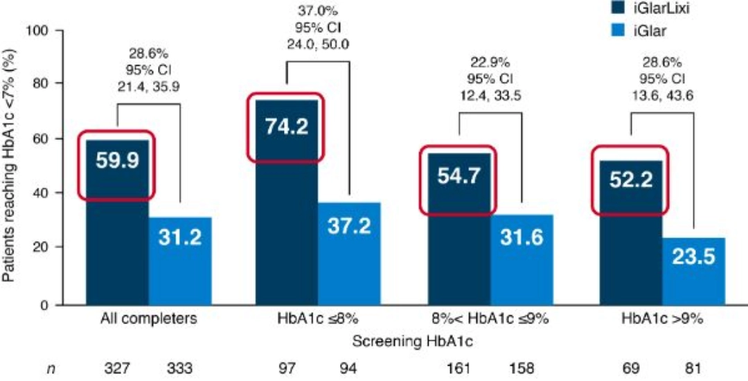 iGlarLixi was associated with greater HbA1c reductions than sequential intensification with insulin glargine + lixisenatide