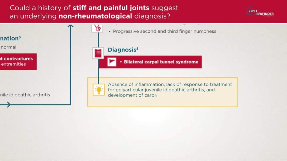 By simulating a real-life Scenario this case study developed to increase the awareness of MPS I, by highlighting familiar symptoms that suggest the possibility of an unfamiliar underlying metabolic disease for Rheumatologist specialty.