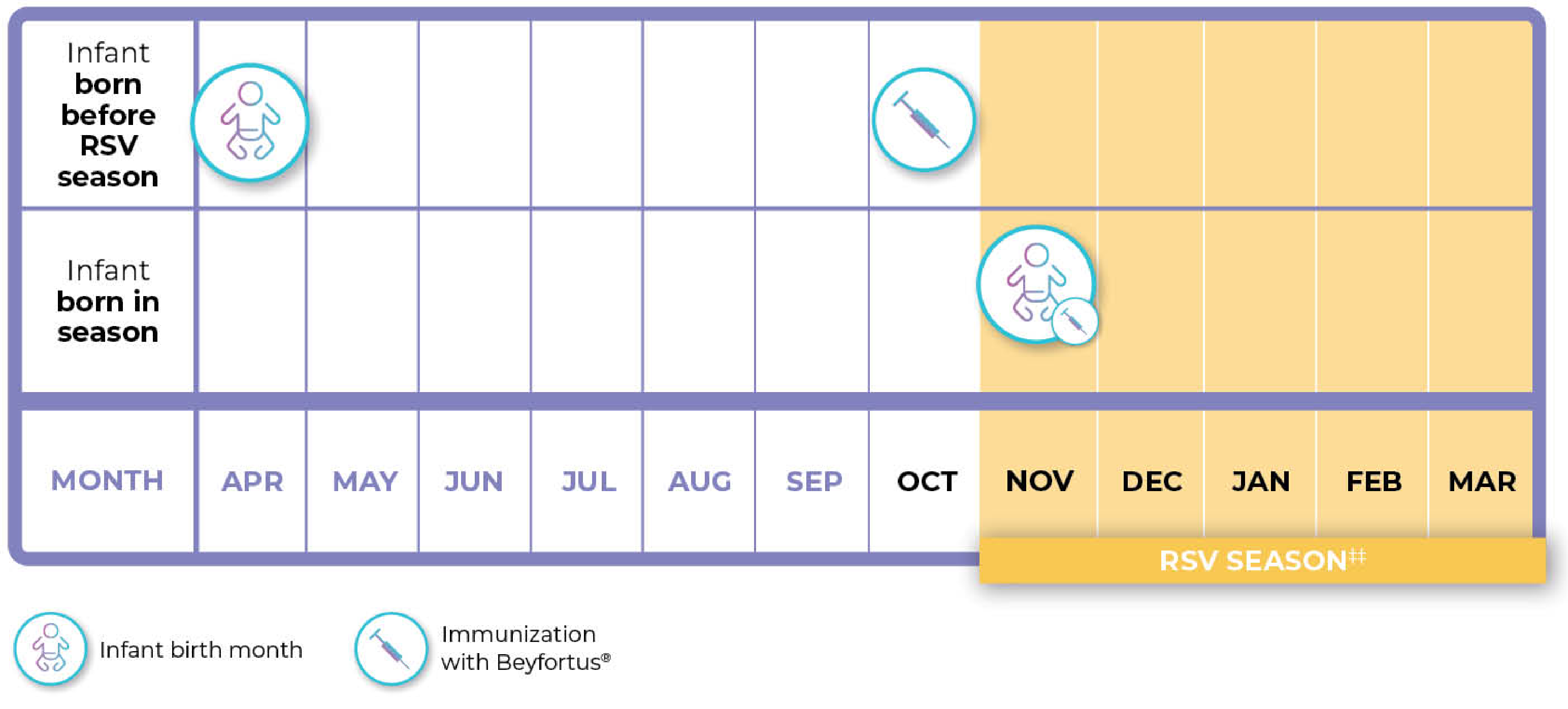 Beyfortus® should be administered prior to commencement of the RSV season, or from birth for infants born during the RSV season¹