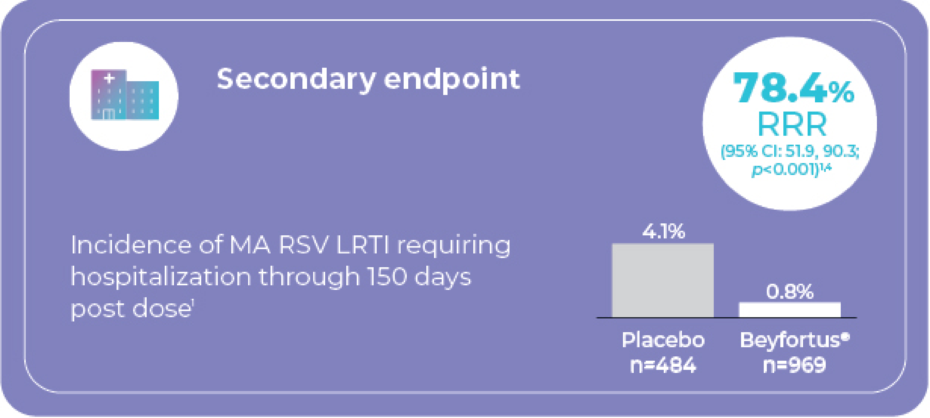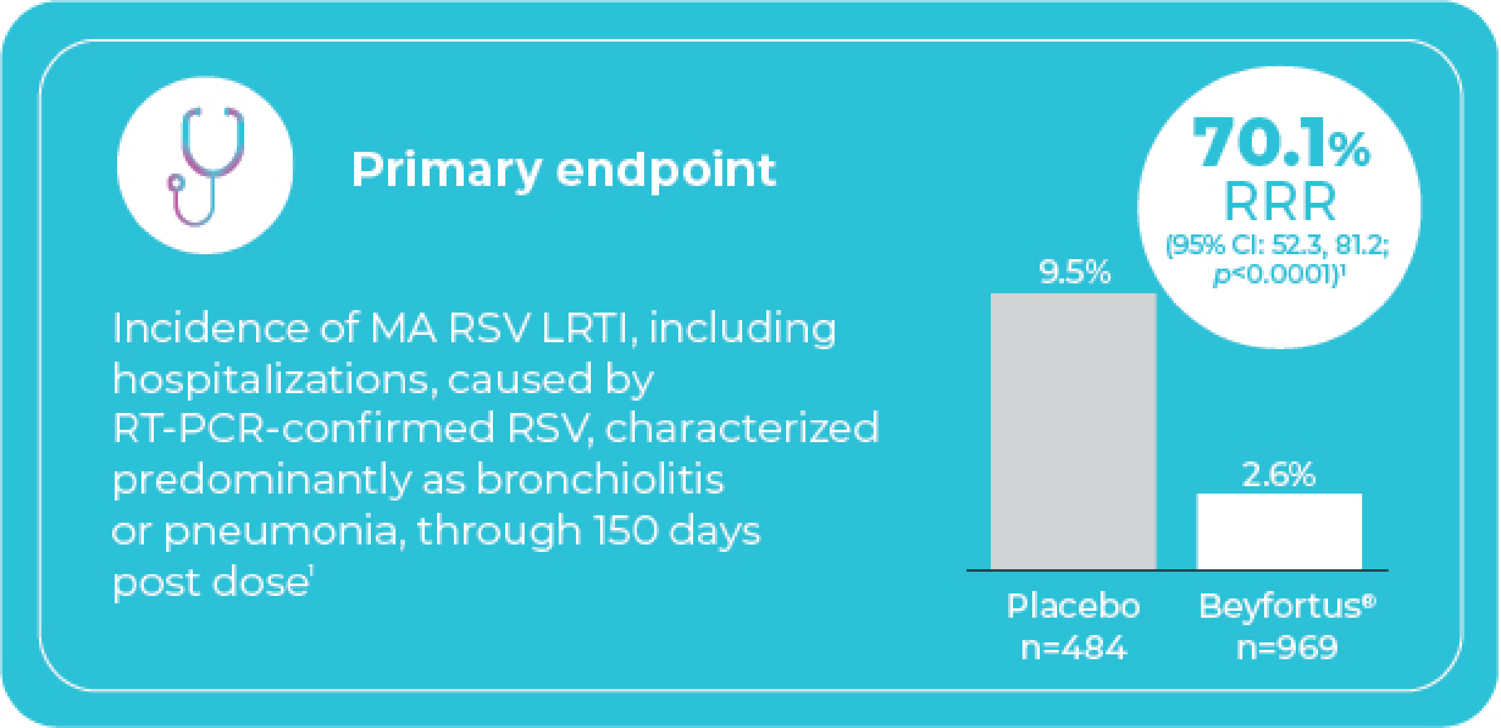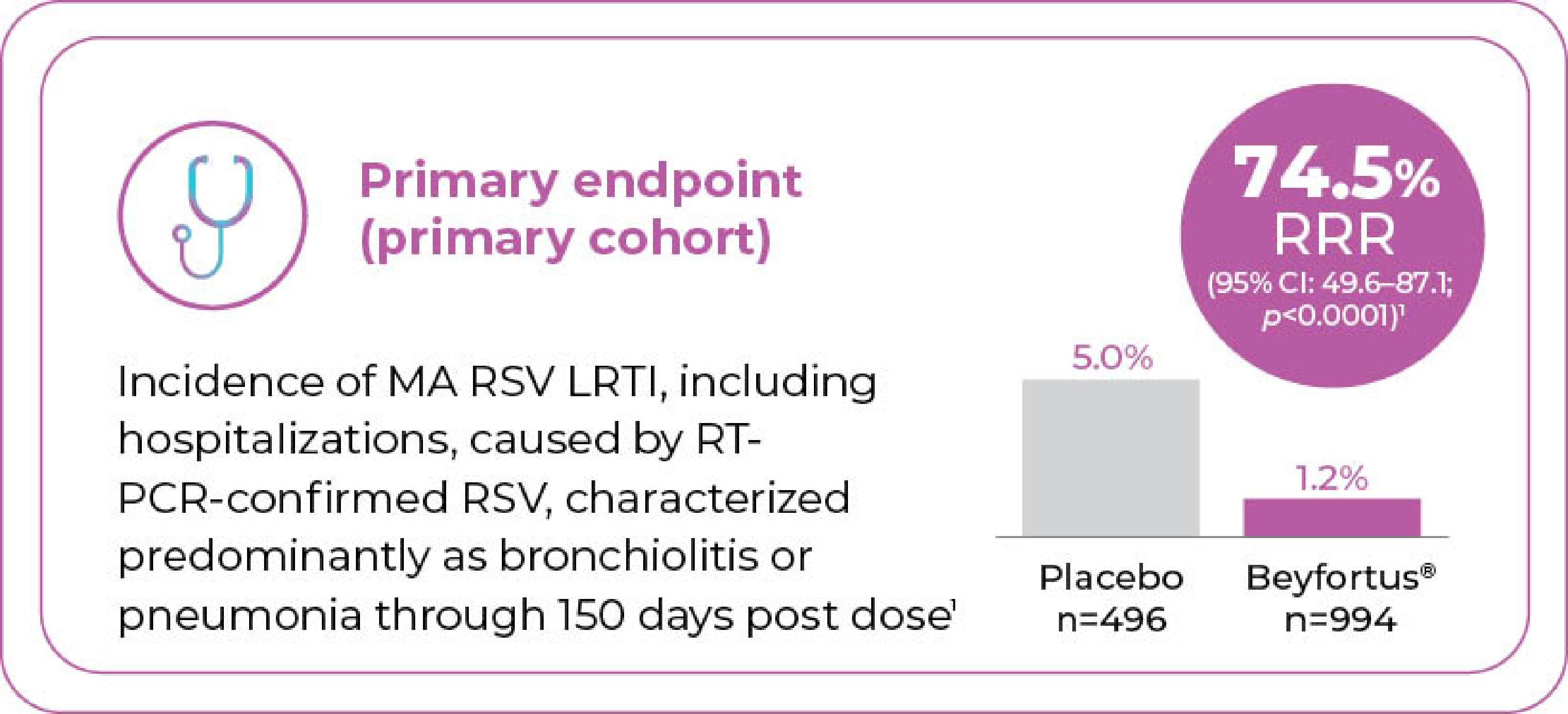 - 76.8% RRR in incidence of MA RSV LRTI requiring hospitalization through to Day 150 vs. placebo (95% Cl: 49.4, 89.4). Incidence was 0.4% with Beyfortus® vs. 2.0% with placebo1