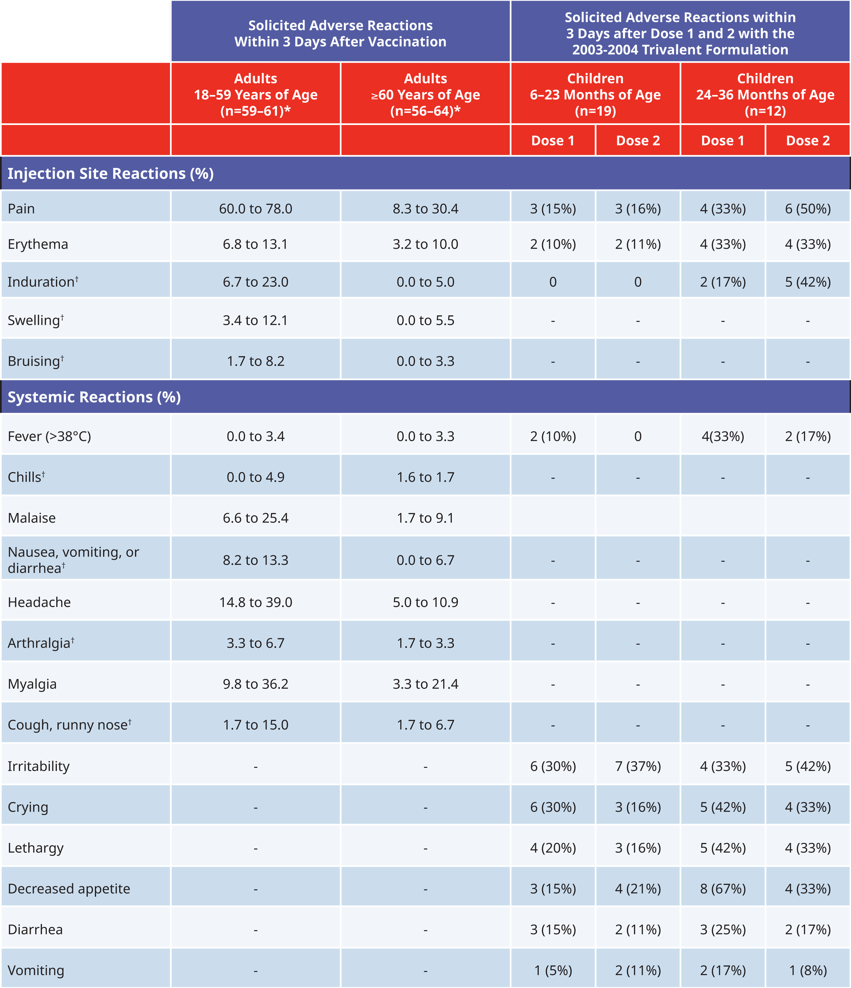Percentage of Solicited Injection-Site Reactions and Systemic Adverse Events in Children and Adults After Vaccination with FLUZONE® Trivalent