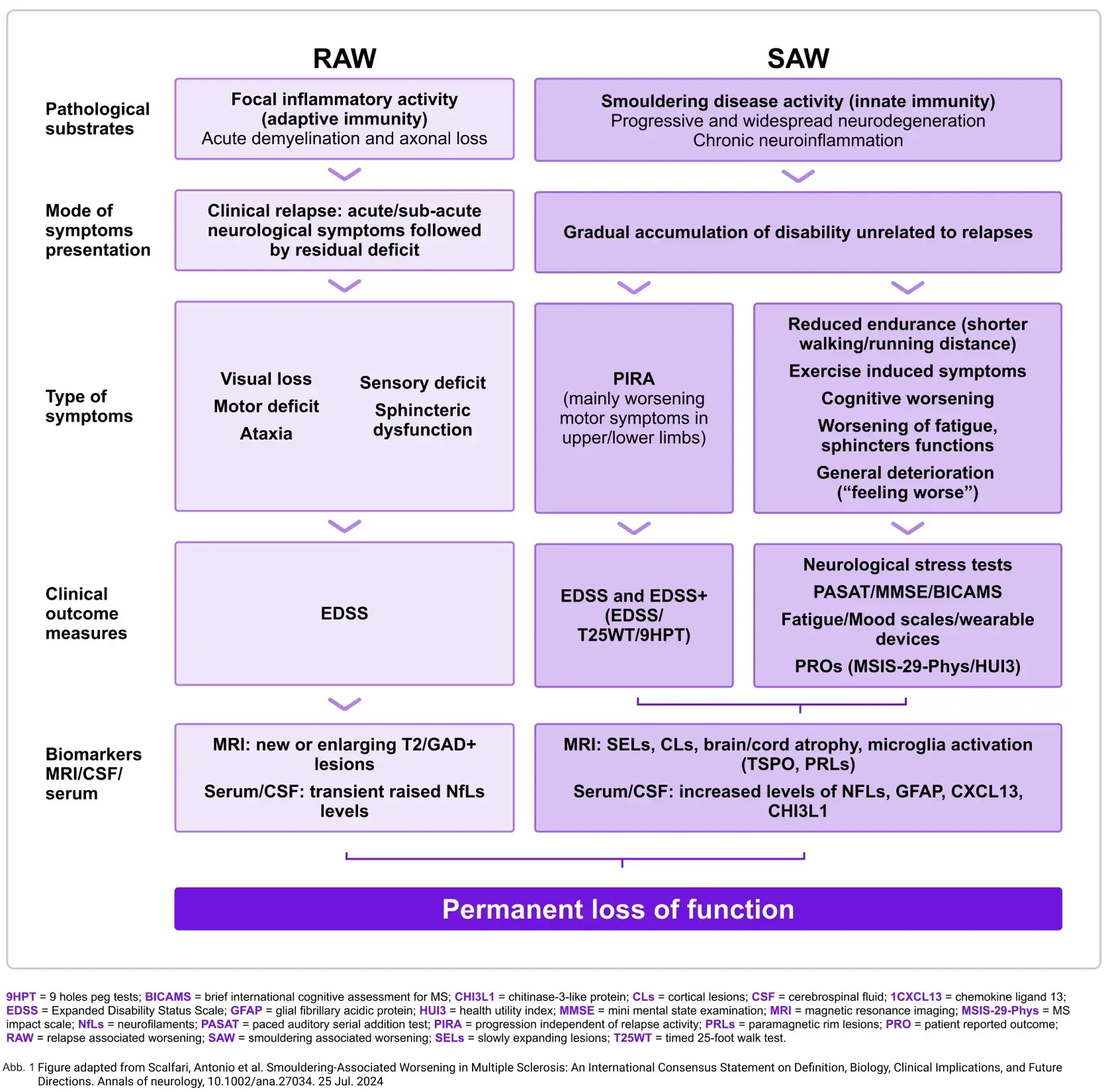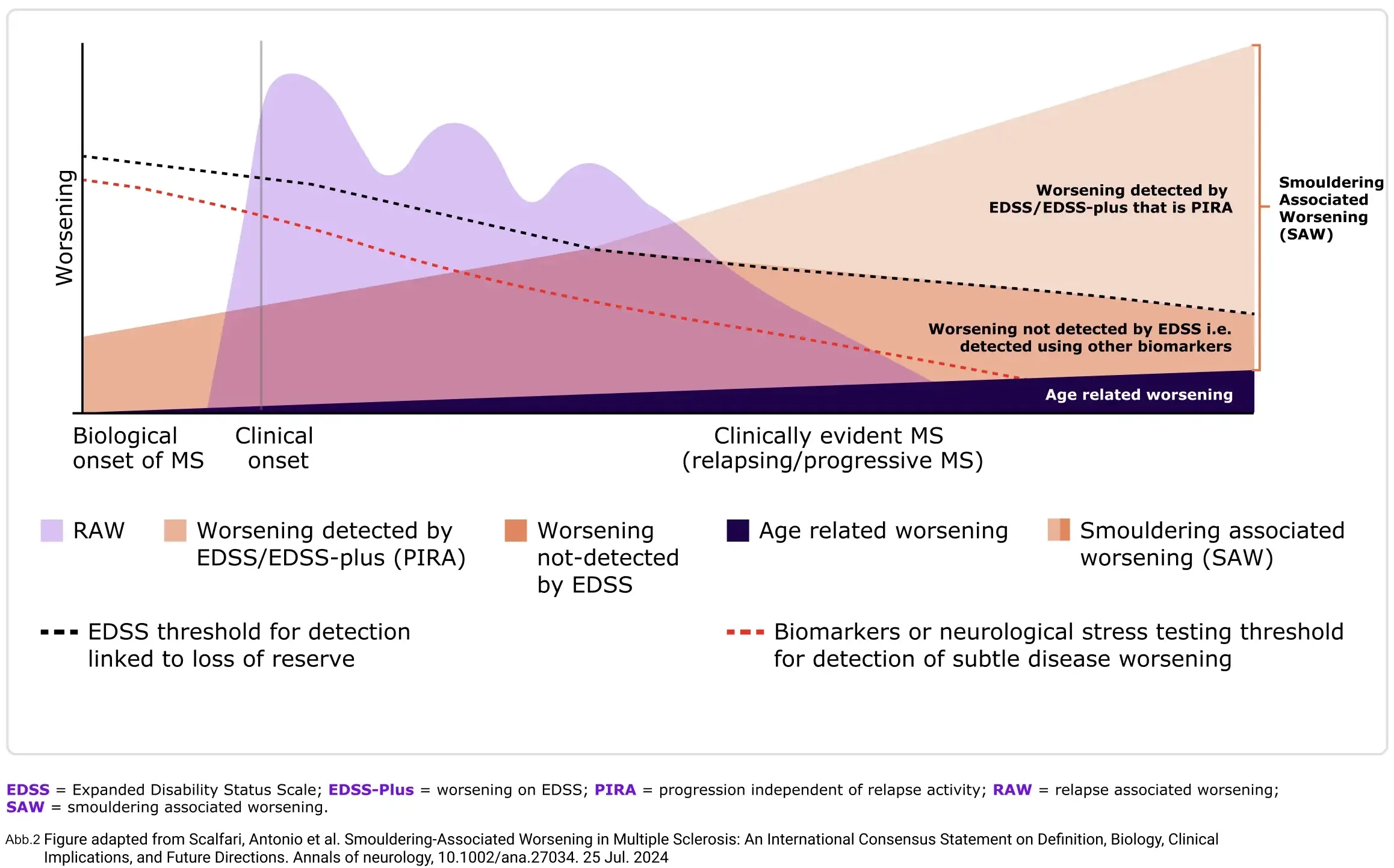 Das SAW-Konzept erkennt an, dass viele MS-Patienten eine subtile klinische Verschlechterung erfahren, obwohl keine akuten Schübe oder sichtbare entzündliche Magnetresonanztomographie (MRT) Aktivität vorliegt. Dem Konsens zufolge wird diese Verschlechterung durch zugrundeliegende „schwelende“ pathologische Prozesse verursacht und trägt wesentlich zur langfristigen Behinderung bei. Der Konsens unterstreicht die Notwendigkeit, solche schwelenden Verschlechterungen, die durch chronisch zugrunde liegende pathologische Prozesse verursacht werden, zu erkennen und von schubassoziierten, durch akute Schübe verursachten Verschlechterungen zu unterscheiden (Abb. 1).