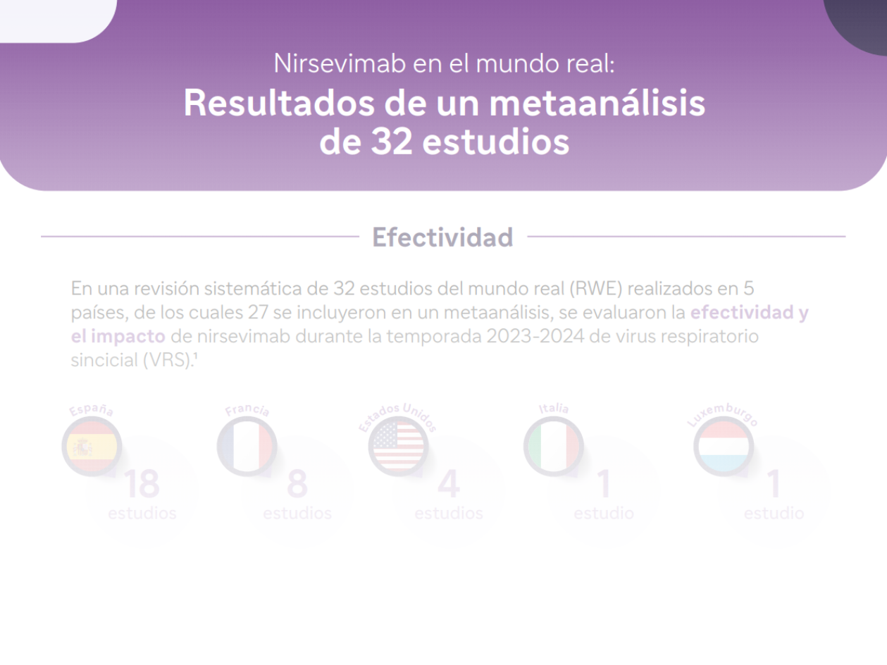 Se presentan los resultados de un metaanálisis de 32 estudios del mundo real que evalúan la efectividad e impacto de nirsevimab (Beyfortus) durante la temporada 2023-2024 del virus respiratorio sincicial (VRS). Los estudios fueron realizados en 5 países: España (18 estudios), Francia (8 estudios), Estados Unidos (4 estudios), Italia (1 estudio) y Luxemburgo (1 estudio).