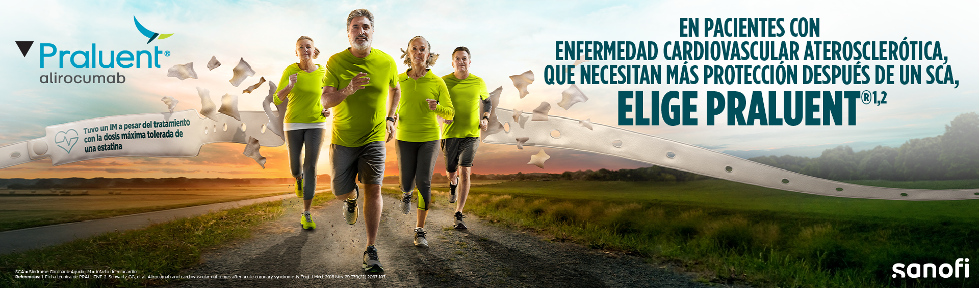 Praluent está indicado en adultos con enfermedad cardiovascular aterosclerótica establecida para reducir el riesgo CV, disminuyendo los niveles de c-LDL, como tratamiento adyuvante a la corrección de otros factores de riesgo1.