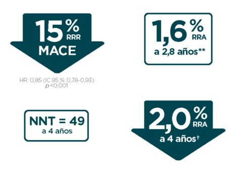 *Objetivo principal del estudio. **Incidencia acumulada de eventos observada en la mediana de 2,8 años. †Incidencia acumulada de eventos estimada a los 4 años. c-LDL: colesterol LDL; MACE: eventos CV adversos mayores; NNT: número necesario a tratar; RRA: reducción del riesgo absoluto.
