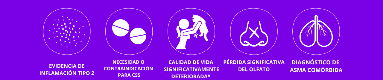 Las guías internacionales EPOS y EUFOREA recomiendan el tratamiento con terapia biológica en pacientes con Rinosinusitis Crónica con Poliposis Nasal que cumplan los siguientes criterios: