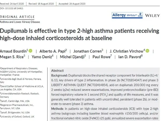 Dupilumab is effective in type 2‐high asthma patients receiving high‐dose inhaled corticosteroids at baseline - Bourdin et al, Allergy 2021 Jan;76(1):269-280 doi: 10.1111/all.14611. Epub 2020 Oct 21.