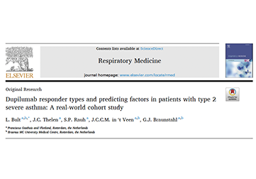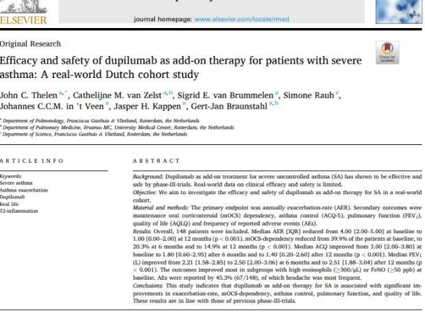 Thelen, J. C., van Zelst, C. M., van Brummelen, S. E., Rauh, S., In 't Veen, J. C. C. M., Kappen, J. H., & Braunstahl, G. J. (2023). Efficacy and safety of dupilumab as add-on therapy for patients with severe asthma: A real-world Dutch cohort study. Respiratory medicine, 206, 107058. https://doi.org/10.1016/j.rmed.2022.107058