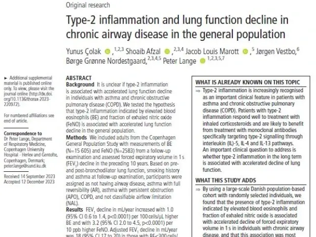 Yunus Çolak, Shoaib Afzal, Jacob Louis Marott, Jørgen Vestbo, Børge Grønne Nordestgaard, Peter Lange (2024). Type-2 inflammation and lung function decline in chronic airway disease in the general population.Thorax 2024;0:1–10. doi:10.1136/thorax-2023-220972