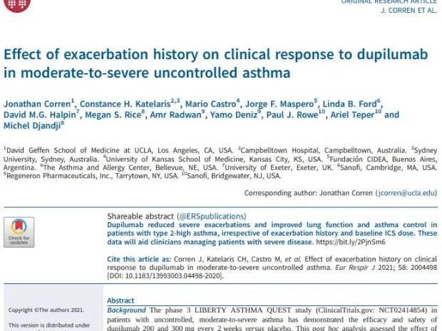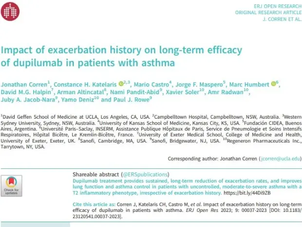 Corren J, Katelaris CH, Castro M, et al. Impact of exacerbation history on long-term efficacy of dupilumab in patients with asthma. ERJ Open Res 2023; in press (https://doi.org/10.1183/23120541.00037-2023).