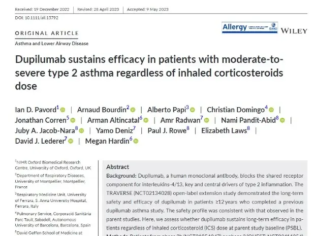 Pavord, I. D., Bourdin, A., Papi, A., Domingo, C., Corren, J., Altincatal, A., Radwan, A., Pandit-Abid, N., Jacob-Nara, J. A., Deniz, Y., Rowe, P. J., Laws, E., Lederer, D. J., & Hardin, M. (2023). Dupilumab sustains efficacy in patients with moderate-to-severe type 2 asthma regardless of ICS dose. Allergy, 10.1111/all.15792. Advance online publication. https://doi.org/10.1111/all.15792