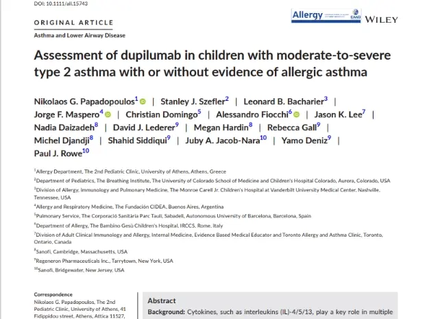 Papadopoulos NG, Szefler SJ, Bacharier LB, Maspero JF, Domingo C, Fiocchi A, Lee JK, Daizadeh N, Lederer DJ, Hardin M, Gall R, Djandji M, Siddiqui S, Jacob-Nara JA, Deniz Y, Rowe PJ. Assessment of dupilumab in children with moderate-to-severe type 2 asthma with or without evidence of allergic asthma. Allergy. 2023 Aug;78(8):2157-2167. doi: 10.1111/all.15743. Epub 2023 May 25. PMID: 37059696.
