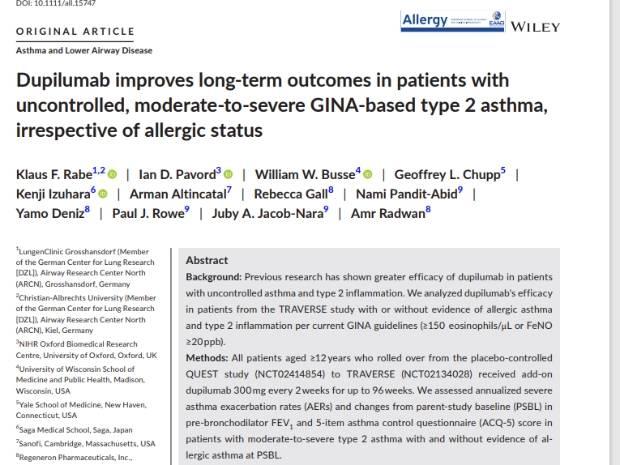 Rabe KF, Pavord ID, Busse WW, Chupp GL, Izuhara K, Altincatal A, Gall R, Pandit-Abid N, Deniz Y, Rowe PJ, Jacob-Nara JA, Radwan A. Dupilumab improves long-term outcomes in patients with uncontrolled, moderate-to-severe GINA-based type 2 asthma, irrespective of allergic status. Allergy. 2023 Aug;78(8):2148-2156. doi: 10.1111/all.15747. Epub 2023 May 21. PMID: 37073882.