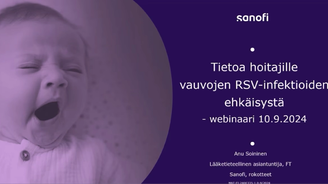 Esityksestä saat tietoa vauvojen RSV-infektioiden ehkäisystä. Siihen on koottu olennaisimmat tiedot RS-viruksesta, sen aiheuttamasta tautitaakasta sekä imeväisten RSV:n ehkäisyyn tarkoitetun RSV-vasta-aineen oikeasta ja turvallisesta käytöstä. Esitys on tarkoitettu hoitajille, lääkäreille, farmaseuteille ja proviisoreille.