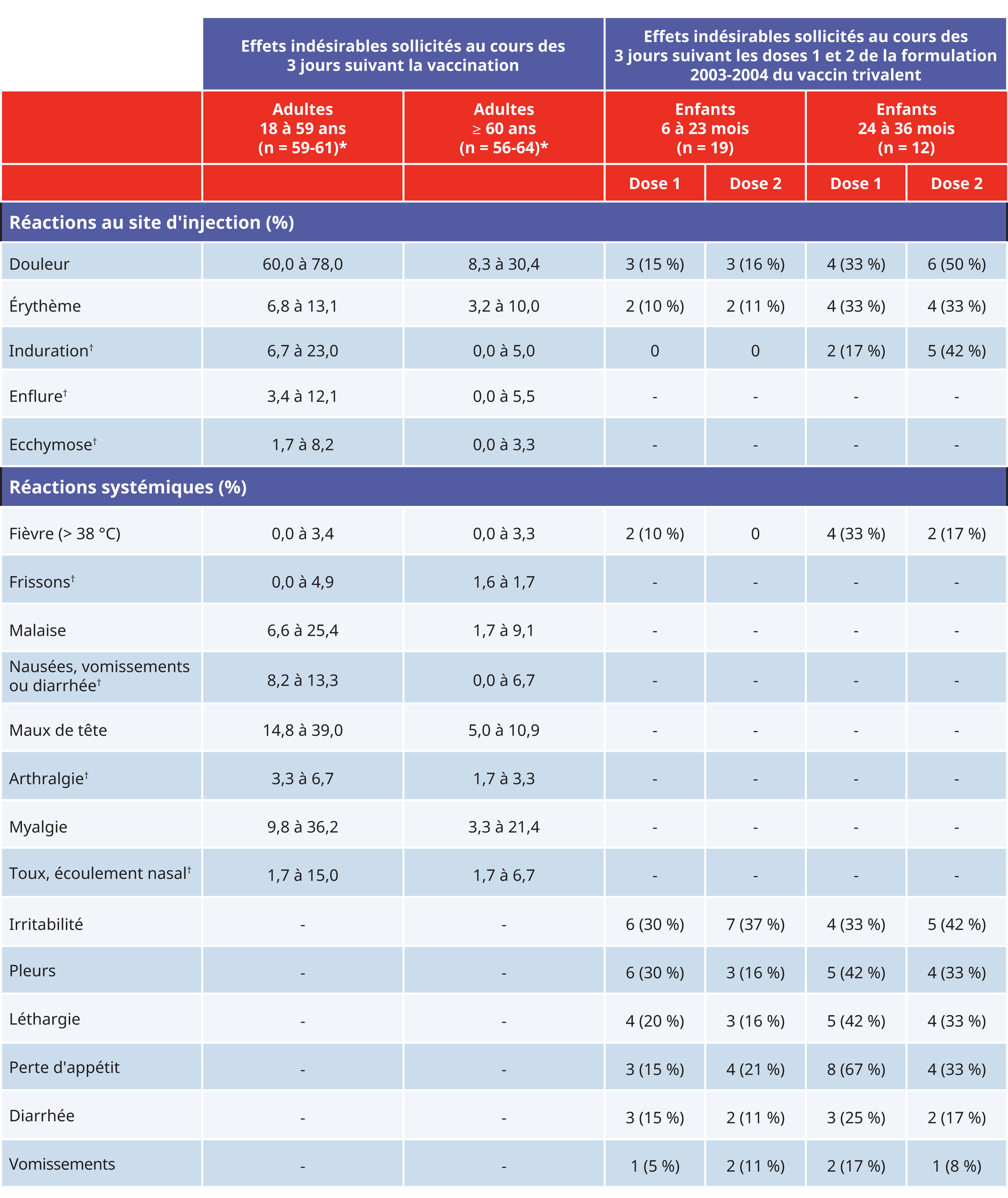 Pourcentage des réactions au site d’injection et événements systémiques indésirables sollicités chez les enfants et les adultes suivant la vaccination avec FLUZONEMD Trivalent