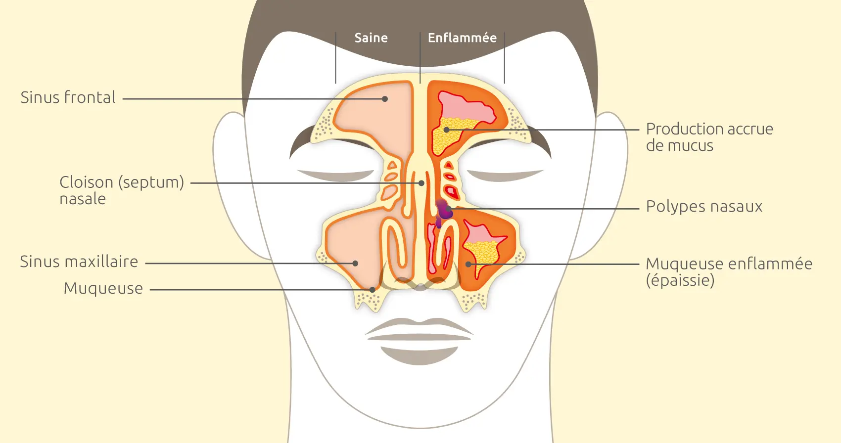 La «rhinosinusite» désigne l’inflammation de la muqueuse nasale (rhinite) et de la muqueuse des sinus nasaux (sinusite), une différence étant faite entre une inflammation aiguë et chronique. La polypose naso-sinusienne (abrégée en PNS) se manifeste par des protubérances bénignes de la muqueuse. Ces polypes nasaux ne mesurent parfois que quelques millimètres, mais peuvent atteindre une taille de plusieurs centimètres et obstruer entièrement la cavité nasale.