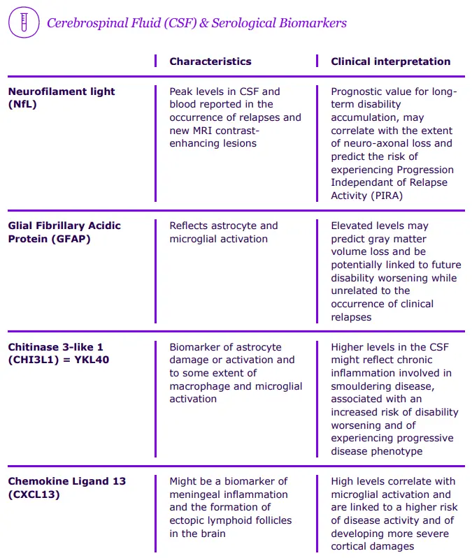 Les techniques d'imagerie et les biomarqueurs présents dans le sérum et le liquide céphalo-rachidien (LCR) pourraient être utilisés pour surveiller plus efficacement SAW (Fig. 1). Il s’agit par exemple du NfL (Neurofilament Light), du GFAP (Glial Fibrillary Acidic Protein), des SELs (Slowly Expanding Lesions) et des PRLs (Paramagnetic Rim Lesions). Ces outils pourraient aider à identifier plus tôt l'activité latente de la maladie et à l’orientation vers des approches thérapeutiques plus personnalisées.