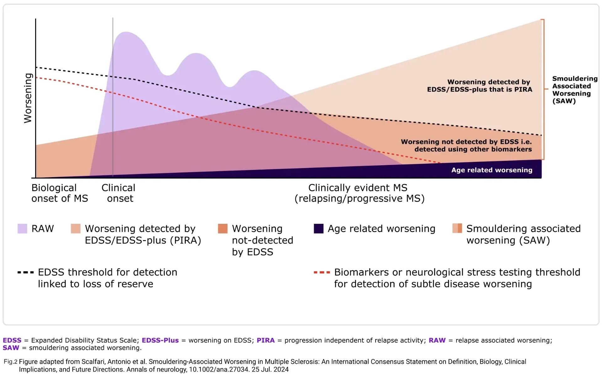 Le concept SAW reconnaît que de nombreux patients atteints de SEP subissent une détérioration clinique subtile malgré l'absence de poussées aiguës ou d'activité inflammatoire visible à l'imagerie par résonance magnétique (IRM). Selon le consensus, cette détérioration est due à des processus pathologiques sous-jacents « couvants » (Smouldering) et contribue considérablement à la progression du handicap sur le long terme. Le consensus souligne la nécessité de reconnaître et de distinguer SAW - résultant de processus pathologiques chroniques sous-jacents – de l'aggravation associée à une rechute (RAW), causée par des rechutes aiguës (Fig. 1).