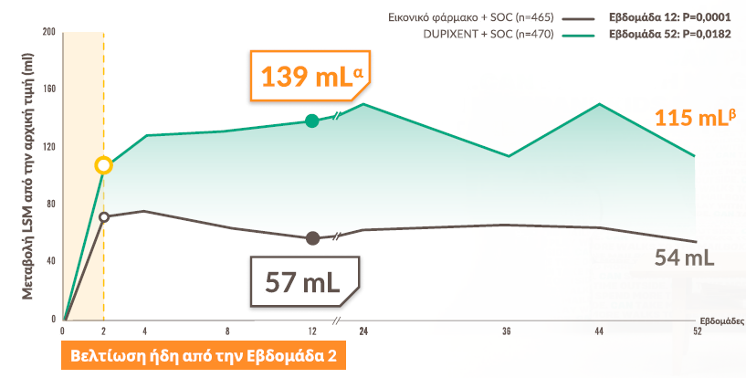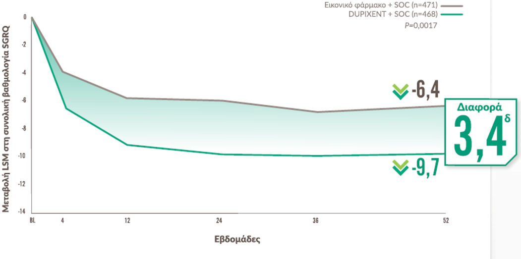 Το 51,5% των ασθενών που έλαβαν DUPIXENTa πέτυχε κλινικά σημαντική βελτίωση στη συνολική βαθμολογία SGRQ (≥4 μονάδες) έναντι 43,1% με εικονικό φάρμακο στη 52η εβδομάδα (P=0,009)8,b,c