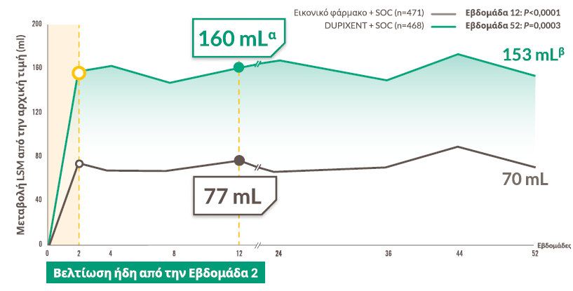 Στη μελέτη NOTUS, οι ασθενείς που έλαβαν DUPIXENTa παρουσίασαν ονομαστική διαφορά LSM στη συνολική βαθμολογία SGRQ σε σύγκριση με το εικονικό φάρμακο κατά 3,37 μονάδες (95% ΔΕ: -5,81, -0,93; P=0,007).1