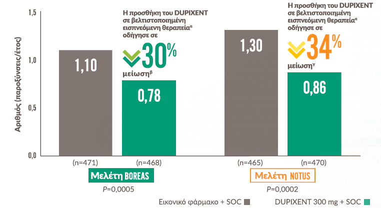 Η προσθήκη του DUPIXENT στη βέλτιστα ρυθμισμένη εισπνεόμενη θεραπείαa οδήγησε σε μείωση των μέτριων ή σοβαρών παροξύνσεων1