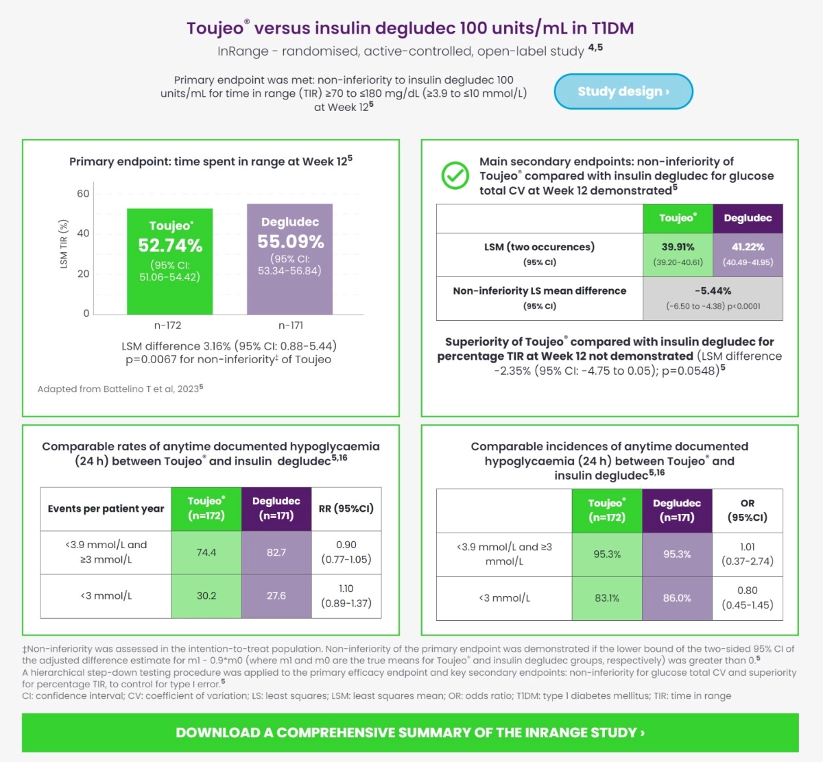 - Battelino T, Danne T et al. Time in range using insulin glargine 300 U/mL versus insulin degludec 100 U/mL in type 1 diabetes: head-to-head randomised controlled InRange trial. Presented at Advanced Technologies and Treatments for Diabetes conference, Barcelona, Spain, 27-30 April 2022; abstract LB009/ #1015