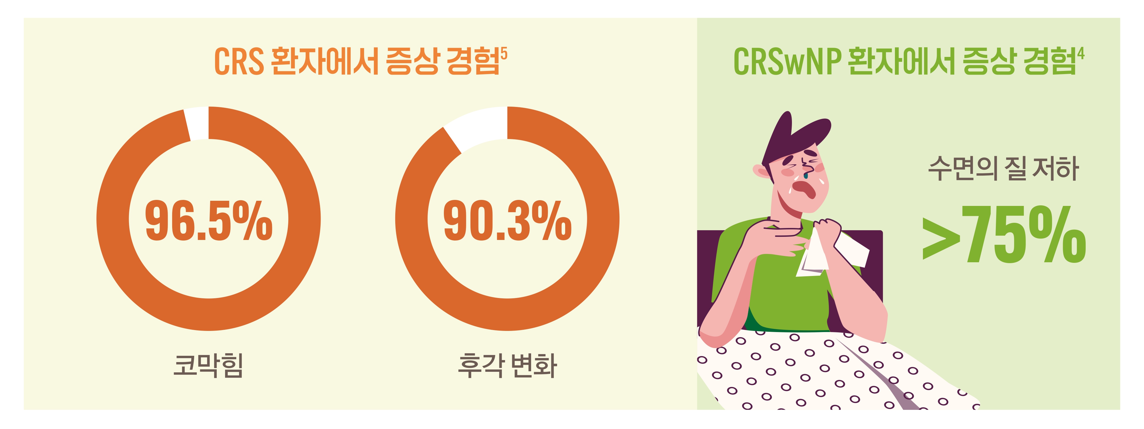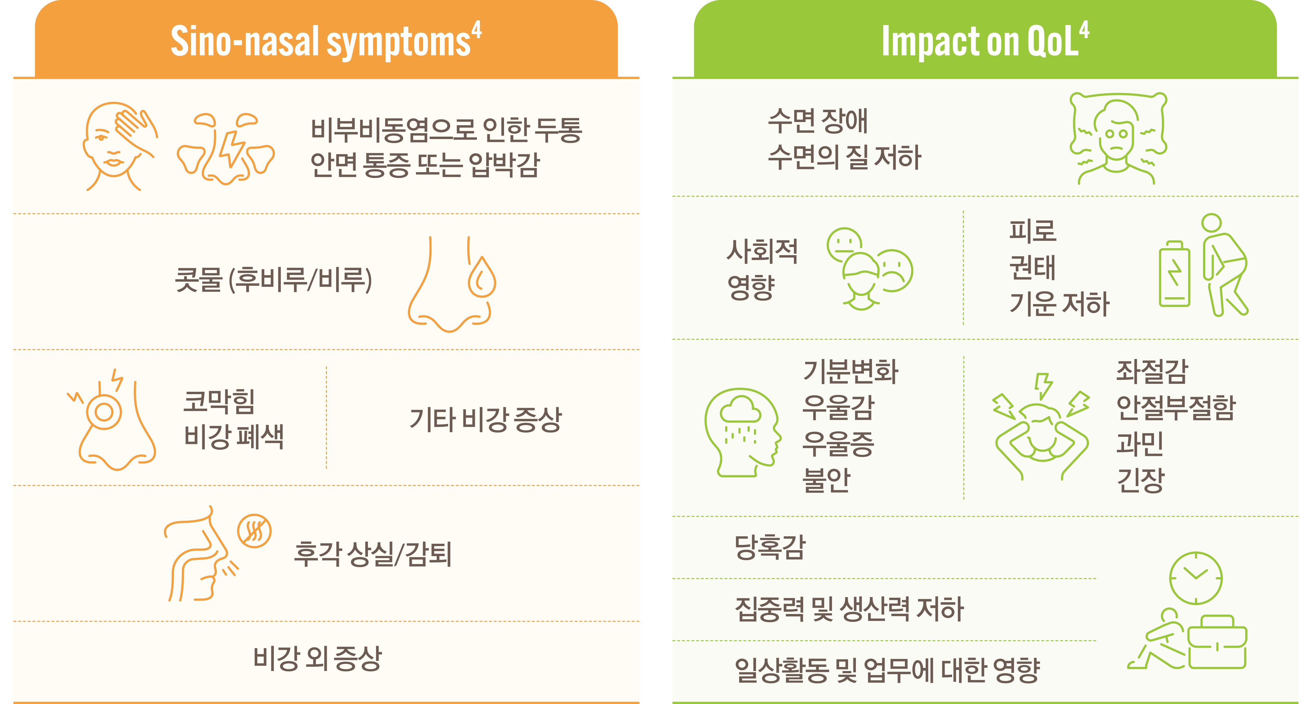 CRSwNP 환자는 코와 부비동과 관련된 증상은 물론 삶의 질 저하와 같은 복합적이고 다양한 증상을 경험합니다.4