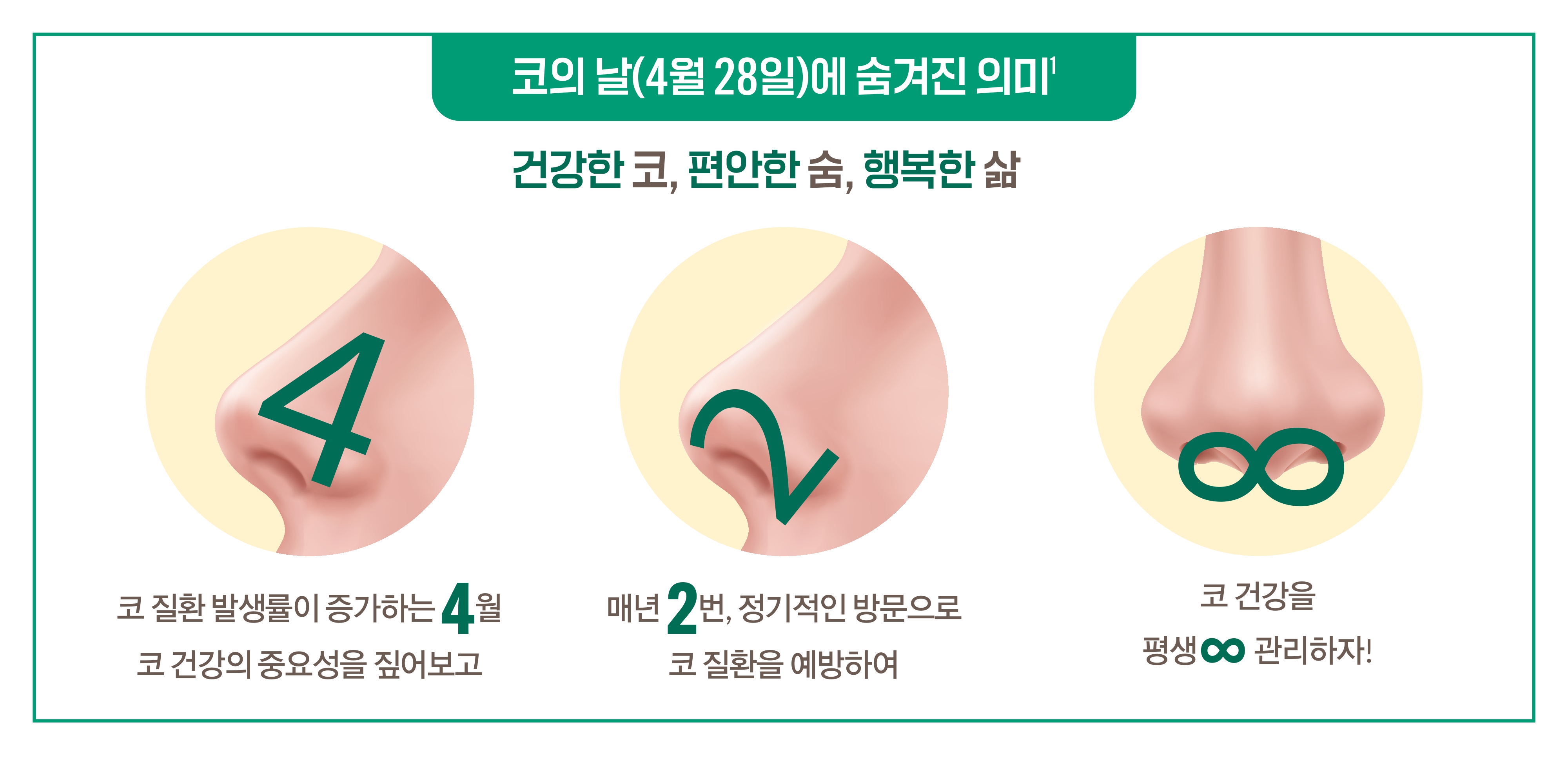 대한비과학회는 코 건강 관리의 중요성을 알리기 위해 매년 4월 28일을 '코의 날'로 제정하였습니다.2,3