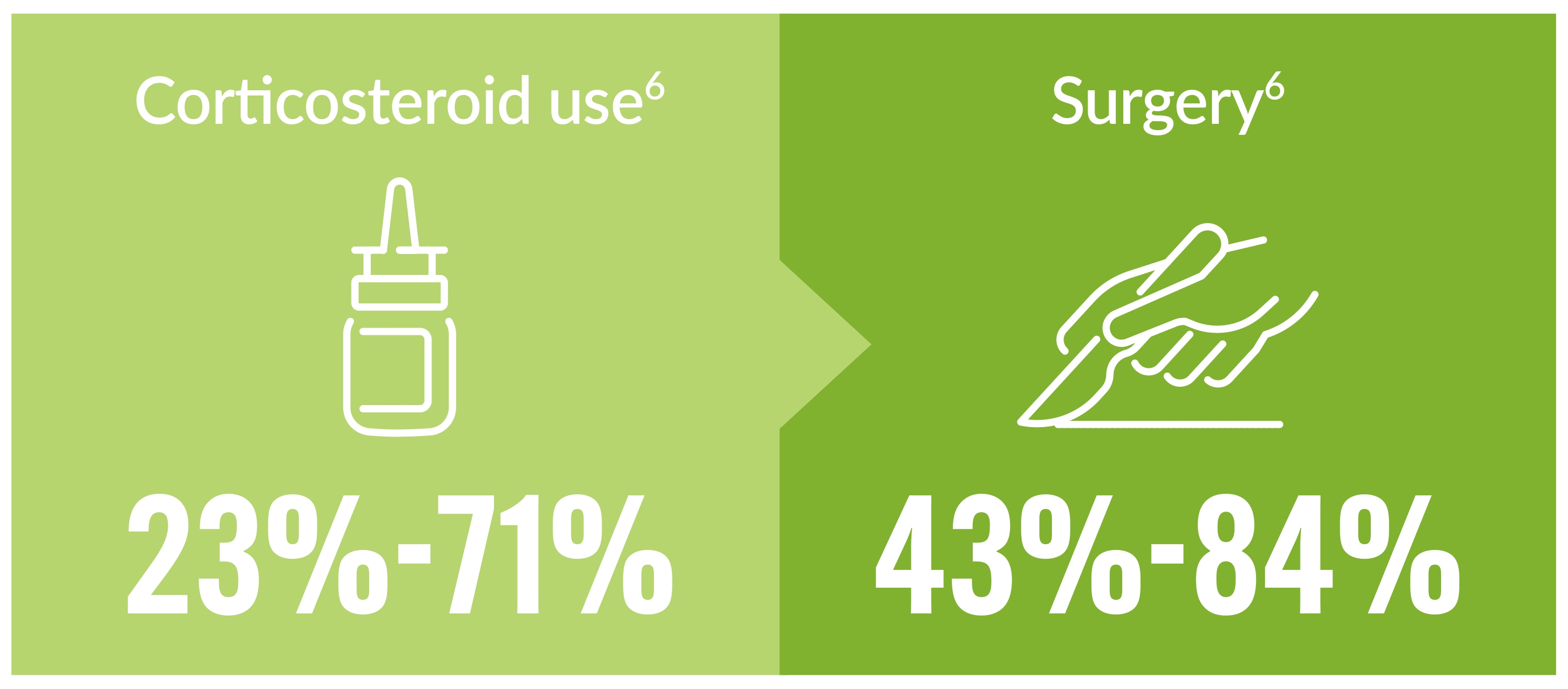 CRSwNP 환자는 증상 조절이 어렵고, 수술과 코르티코스테로이드 사용이 잦습니다.6