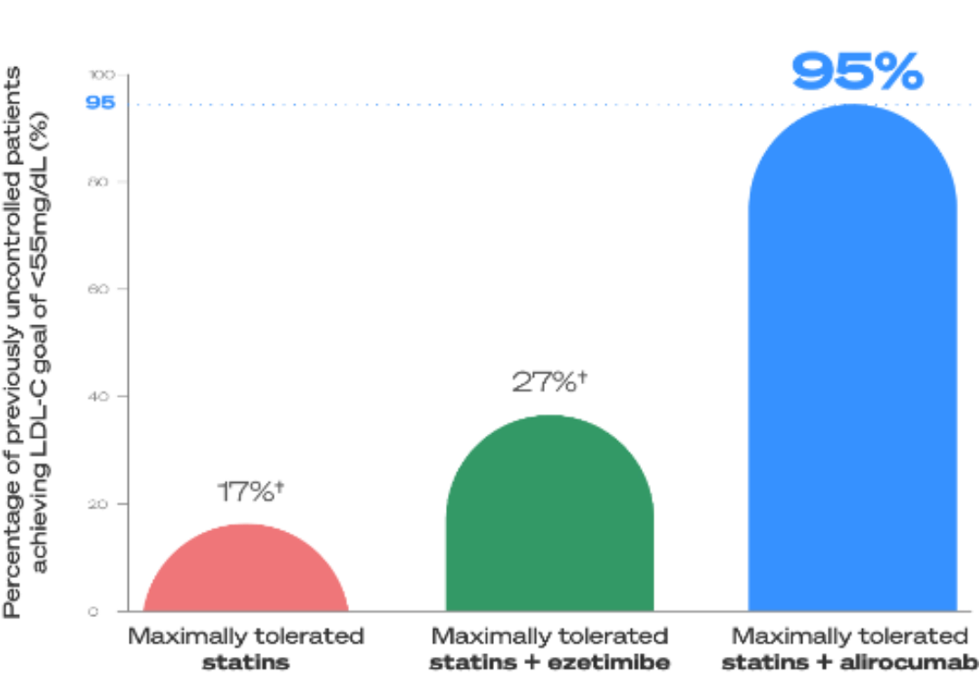 95% of patients achieved the latest LDL-C goal of <55 mg/dL with alirocumab in addition to maximally tolerated statins6||