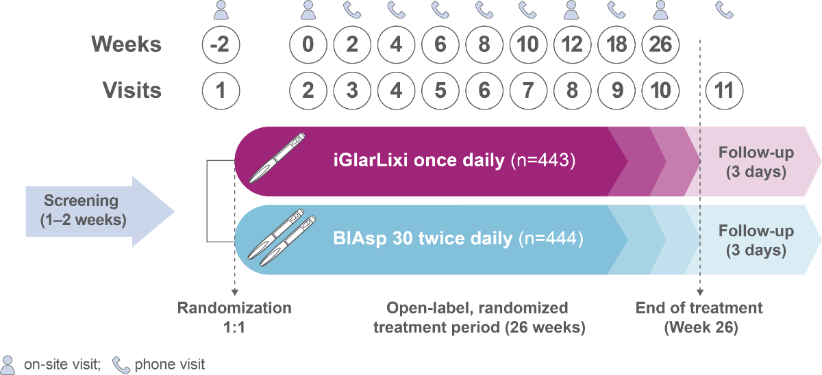Both primary efficacy endpoints were met: iGlarLixi, demonstrated non-inferiority in HbA1c reduction and superiority in bodyweight change from baseline to Week 26 versus BIAsp 30 (ITT population). Secondary analyses showed iGlarLixi was superior to BIAsp 30 in HbA1c reduction.