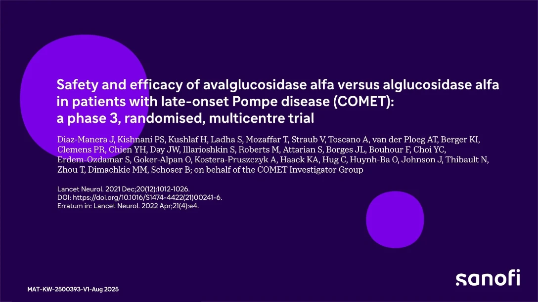 name: `Safety and efficacy of Avalglucosidase Alfa versus Alglucosidase Alfa in patints with Late-Onset Pompe Disease (COMET): a phase 3, randomized, multicentral study results`,