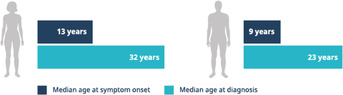 The average time to diagnosis in Fabry disease is 14 years for males and 19 years for females4
