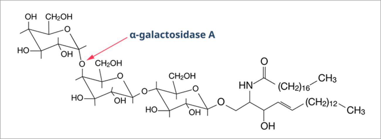 In Fabry disease, mutations in the GLA gene, located on the X chromosome, result in defects in the synthesis and/or function of alpha-galactosidase A (α-Gal A).12 α-Gal A is a lysosomal enzyme, which usually metabolizes globotriaosylceramide (also known as GL-3 or Gb3) and prevents it from accumulating.9
