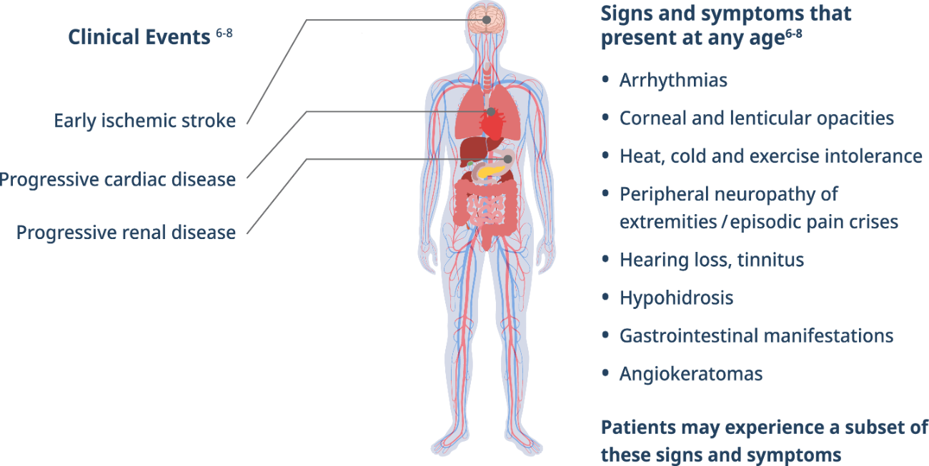 Early signs and symptoms of Fabry disease, which can start as early as childhood or adolescence, may include pain, gastrointestinal disturbances, angiokeratomas, hypohidrosis, proteinuria, and other signs and symptoms.5As Fabry disease progresses, renal function deterioration and hypertrophic cardiomyopathy may occur, and the risk of developing fatal complications such as end-stage renal disease, stroke, cardiac fibrosis, arrhythmias, and premature death increases.5