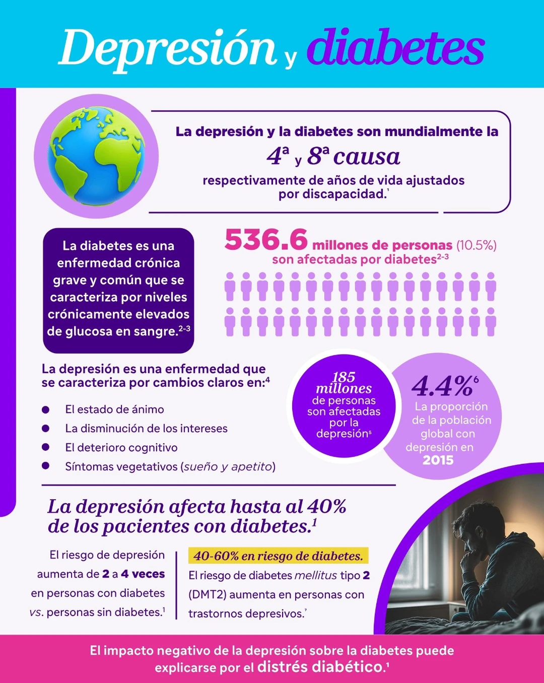 La depresión aumenta hasta 40% el riesgo de diabetes tipo 2, se asocia con distrés diabético, inflamación, resistencia a la insulina y mayor probabilidad de síndrome metabólico.