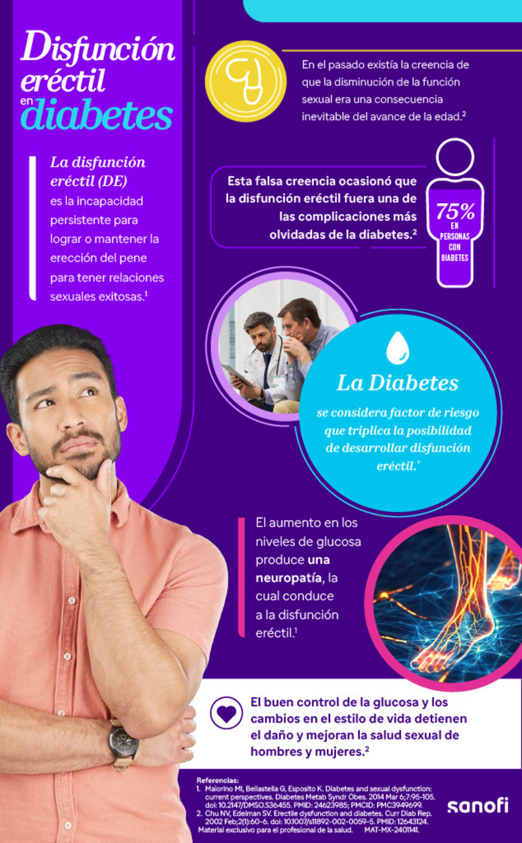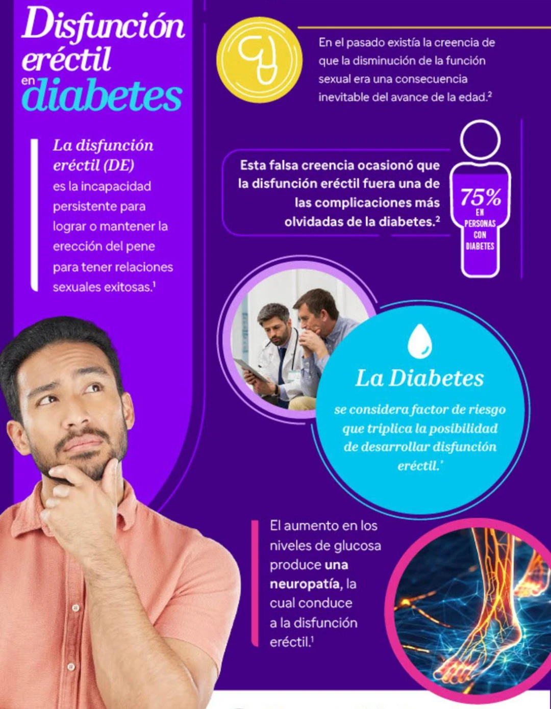 Es la incapacidad persistente para lograr o mantener la erección del pene para tener relaciones sexuales exitosas.1 En el pasado existía la creencia de que la disminución de la función sexual era una consecuencia inevitable del avance de la edad.2 Esta falsa creencia ocasionó que la disfunción eréctil fuera una de las complicaciones más olvidadas de la diabetes.2
