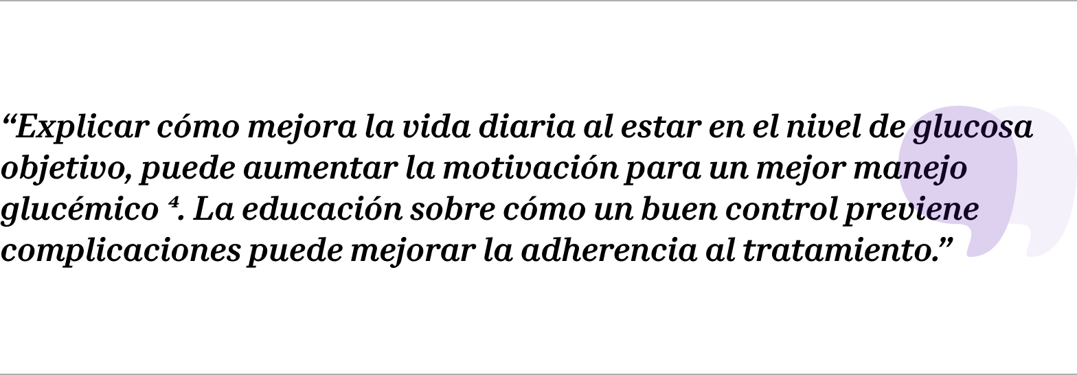 Reconociendo esta mentalidad y utilizando una comunicación proactiva, puedes ayudar a los pacientes a alcanzar sus objetivos glucémicos más pronto y, en última instancia, mejorar los resultados a largo plazo9.