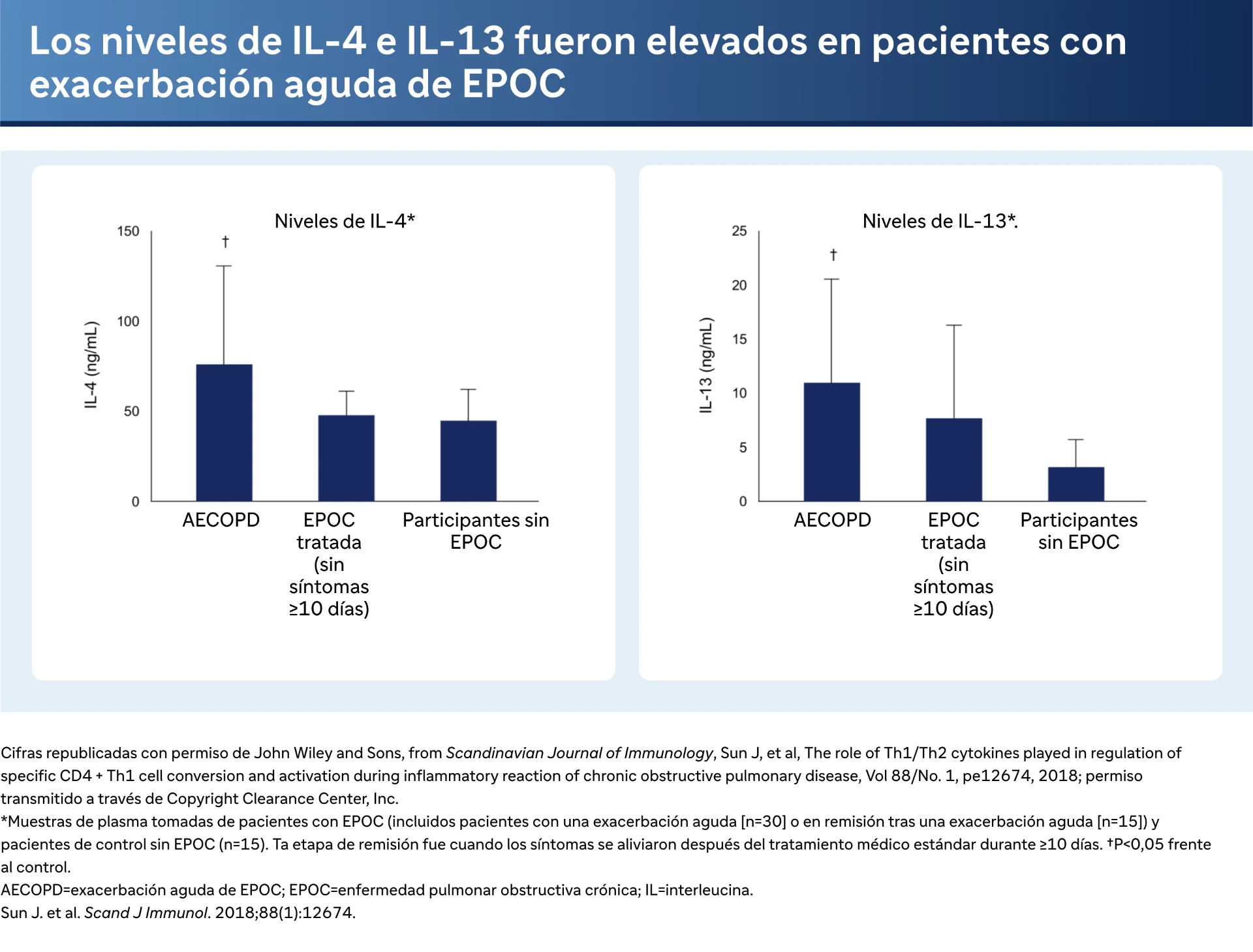 Los niveles de IL-4 e IL-13 también son elevados durante una exacerbación aguda, a diferencia de lo que ocurre en un estado estable o en pacientes sin EPOC. Así que también es importante señalar que estas vías se activan en pacientes con exacerbación aguda de la EPOC y se presentan y son importantes en la EPOC.