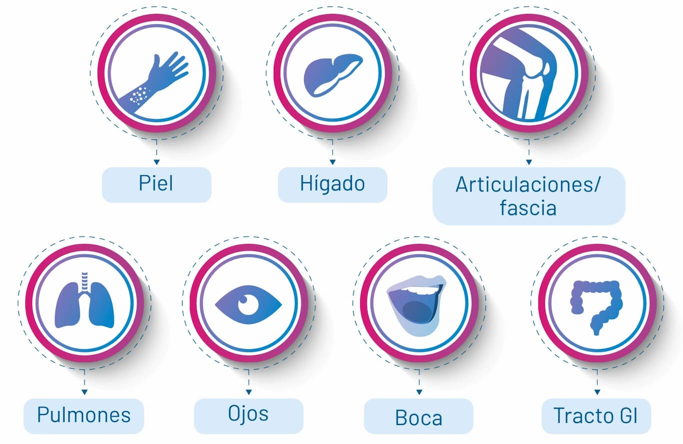 Puede afectar a su paciente cuando el tratamiento no es efectivo, los pacientes enfrentan una amplia variedad de síntomas en múltiples órganos, que pueden empeorar:2,3