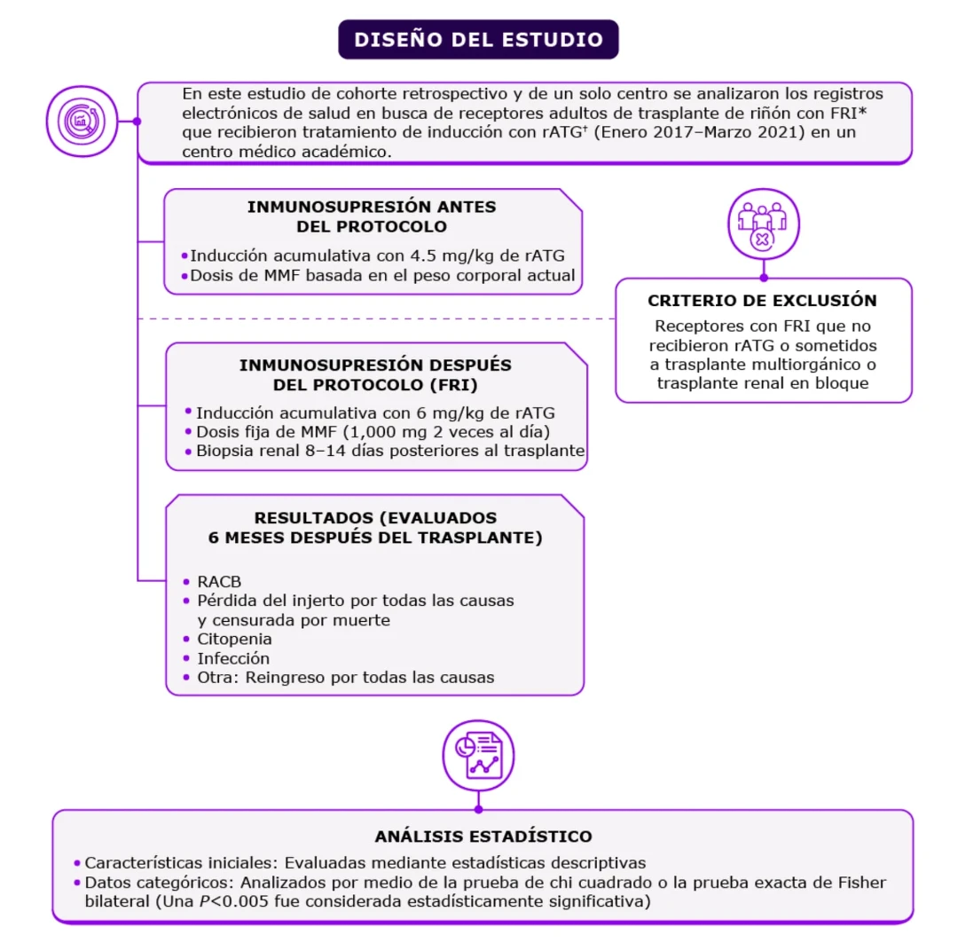 Este estudio de cohorte retrospectivo y de un solo centro evaluó la efectividad y la tolerabilidad a corto plazo de un protocolo que aumentó el estado neto de inmunosupresión en receptores adultos con FRI (N=88), por medio de una inducción acumulativa con 6 mg/kg de rATG y MMF, revelando: